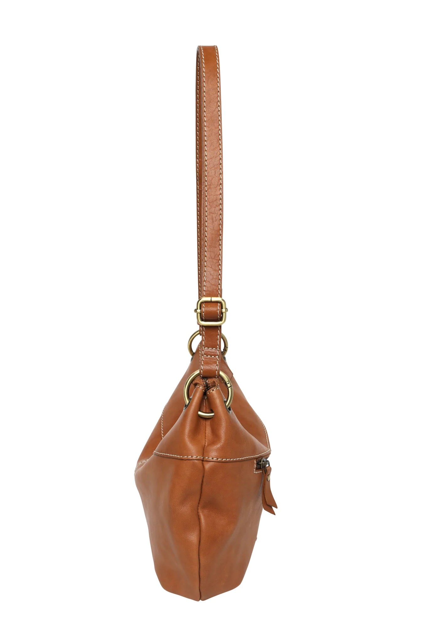 Saddle cross body bag, top zip, back outside zip, attractive heavy contrast stitch.
