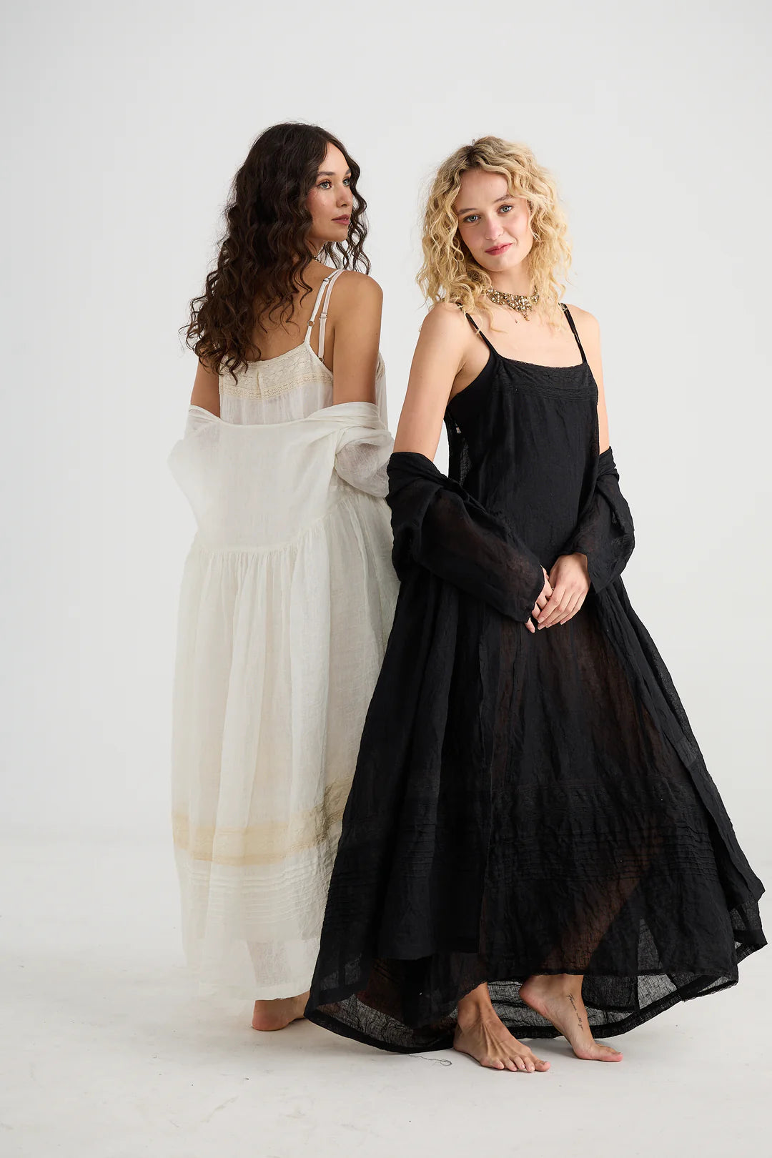 Enchantress is a true statement piece. Dramatic , Theatrical, poetic but also achingly Romantic. With its soft folds of luxurious linen gauze the coat is enriched with exquisite detailing - pintucks and vintage lace prettily adorn it and the simple fine ties bring it together at the front. Truly a sumptuous piece . Perfect for special occasions and weddings.