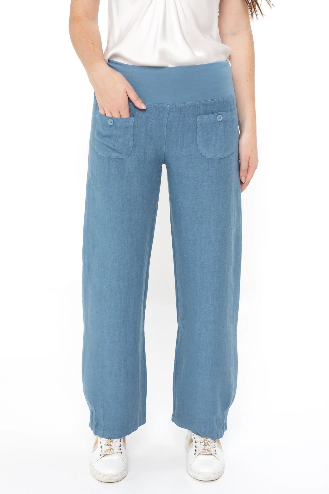 An easy addition to your summer rotation, our best-selling pant style! This signature Elizabeth Scott look features small front pockets with self-covered buttons, as well as a pleated hem for a contemporary silhouette. With 8 sizing options available, and a stretch waistband for easy wear, the "101" Willow Linen Pants offer a comfortable fit for all body types.